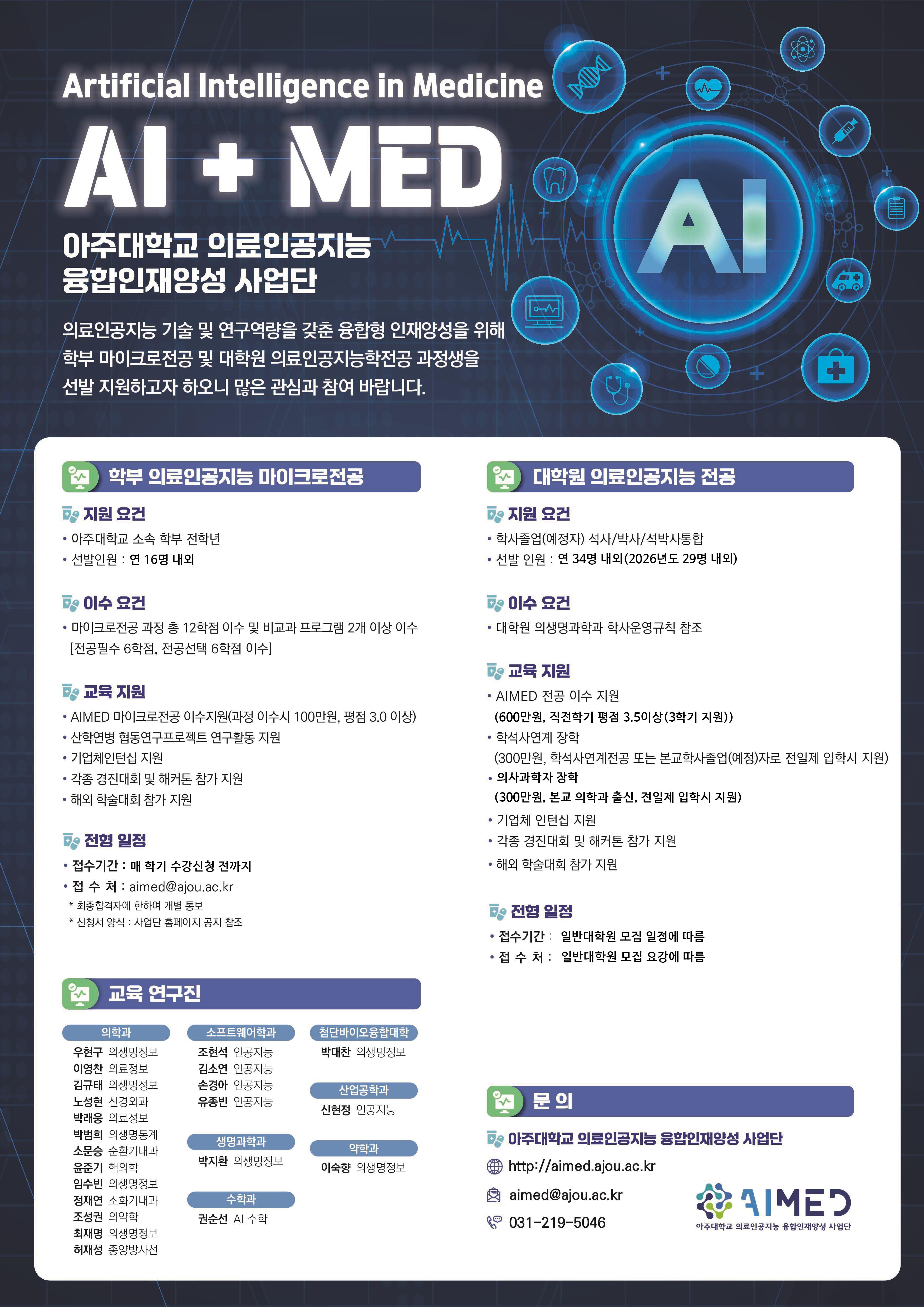 아주대학교 의료인공지능 융합인재양성 사업단에서는 의료인공지능 기술 및 연구역량을 갖춘 융합형 인재양성을 위해 학부 마이크로전공 및 대학원 의료인공지능학전공 과정생을 선발 지원하고자 하오니 많은 관심 부탁드립니다.