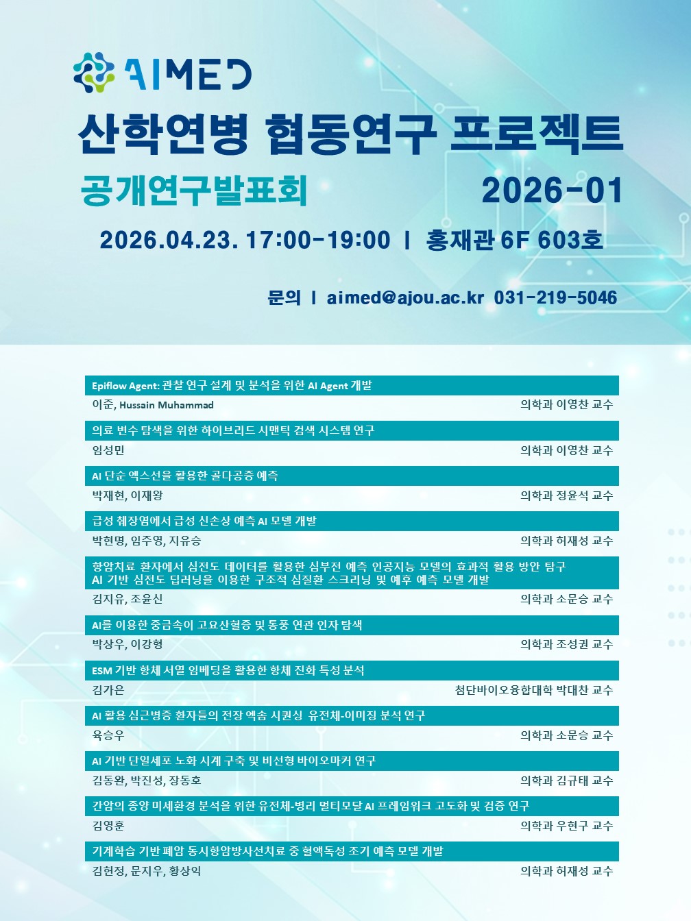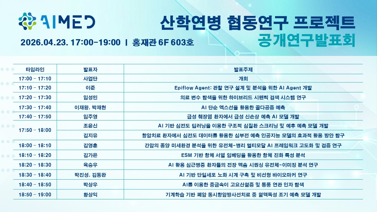 의료인공지능 융합인재양성 사업단에서 2026년도 1학기 산학연병 협동연구 프로젝트 공개연구발표회를 개최합니다. 많은 관심과 참여 부탁드립니다.